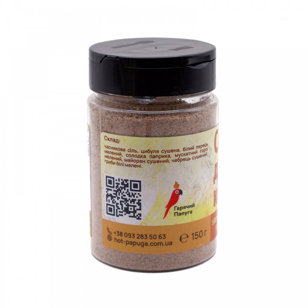 | Склад | часникова сіль, цибуля сушена, білий перець мелений, солодка паприка, мускатний горіх мелений, майоран сушений, чебрець сушений, білі гриби мелені |