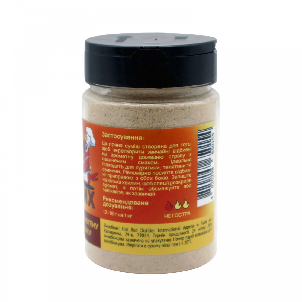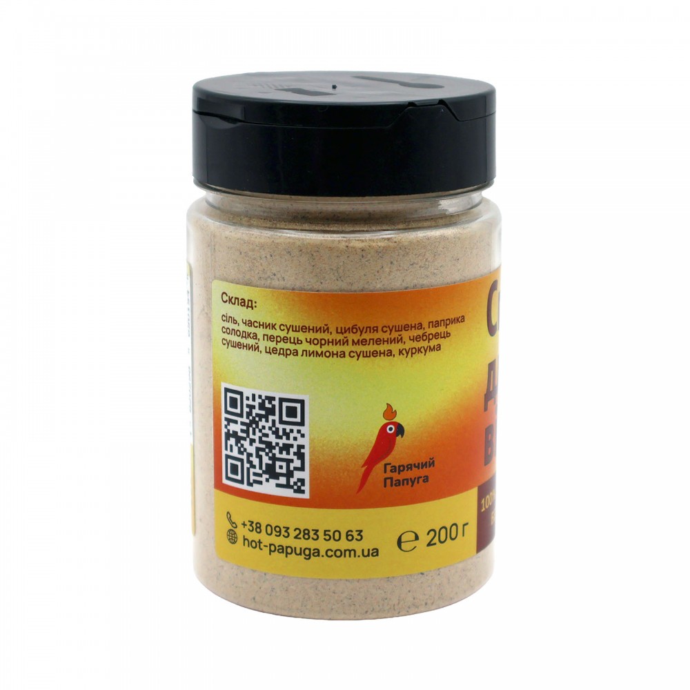 Склад: часник сушений, цибуля сушена, солодка паприка, перець чорний мелений, чебрець сушений, цедра лимона сушена, куркума